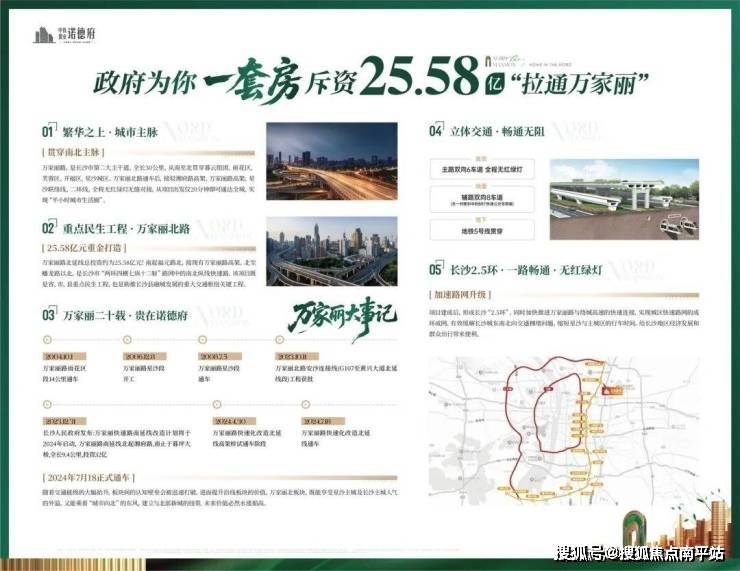 万家丽高架在2024年7.18号全线贯通,作为贯穿整个长沙南北走向的一条城市主动脉,全长约20.8公里,全程没有红绿灯可以快速通达长沙主城区。从项目出发仅15分钟可达芙蓉区,再25分钟可达雨花区,再40分钟可达天心区。项目南侧是星沙联络线,是贯穿长沙东西的城市大动脉,它可以直接连接北二环、万家丽高架。东侧为京港澳高速,通过高速开车三十分钟即可到达长沙两大交通枢纽黄花国际机场和高铁南站。