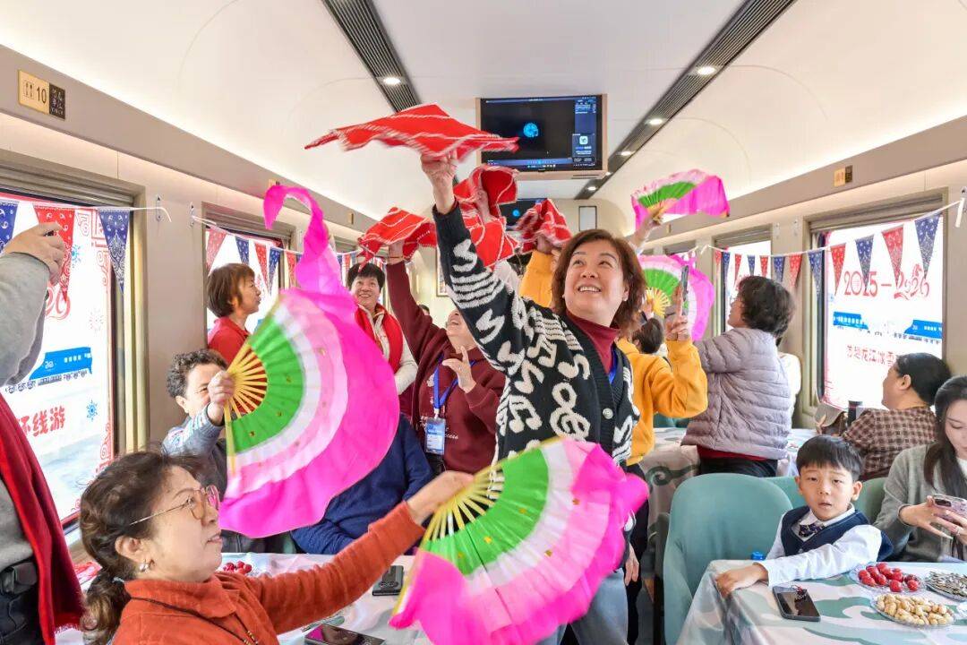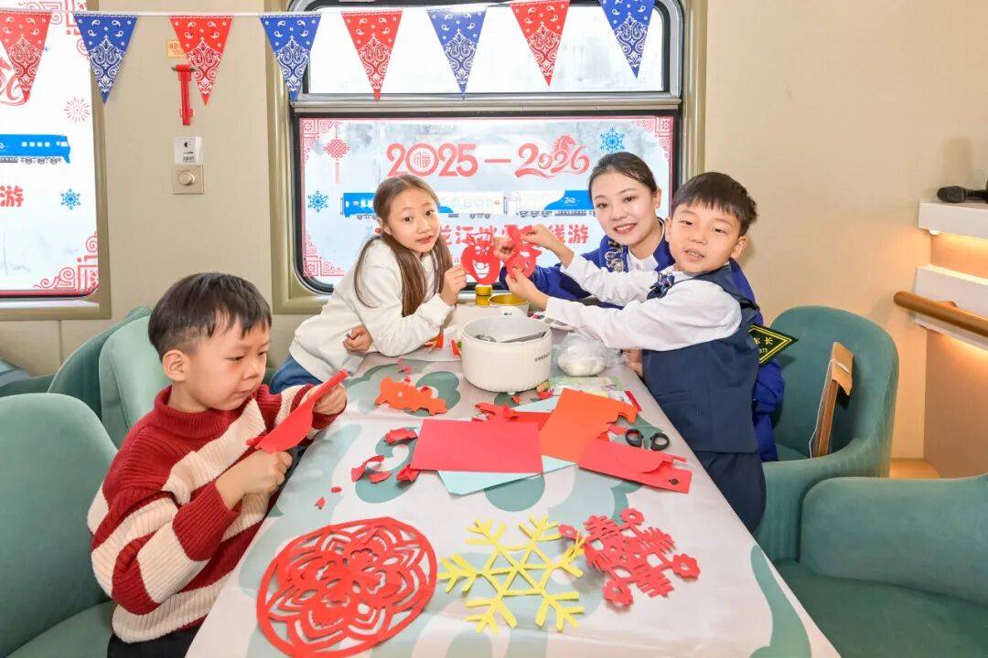 游客将在旅途中迎来2026年的新年曙光,哈尔滨局集团公司组建演艺团队在列车上开展互动演出,游客可换装“东北花袄”来一场秧歌体验,也可以体验剪纸技艺。列车上还提供了冻梨等东北特色小吃;精心设计“2025—2026”跨年背景墙,供游客打卡留念,让龙江冬季旅游从“观光型”向“沉浸型”加速升级。